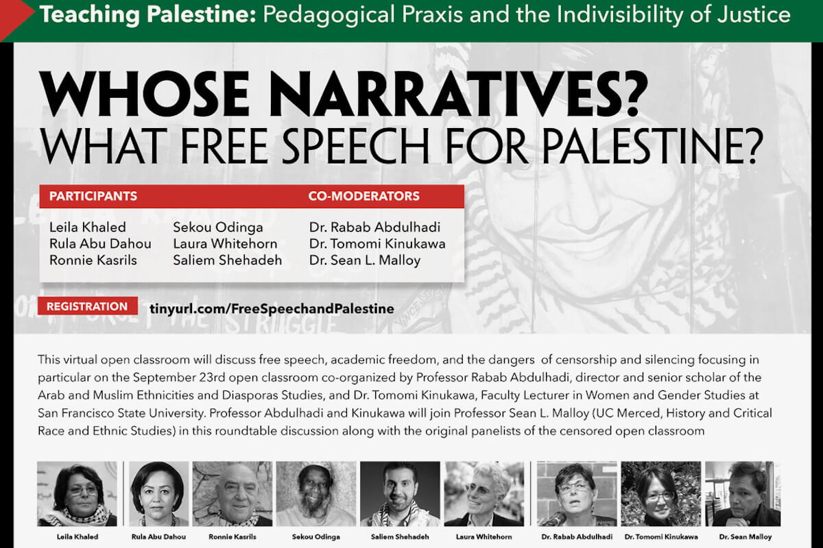 Activism „We now ask for your intervention to end this silencing of Palestine and other narratives of resistance and justice.” Editor’s Note: The following statement was issued on May 3, 2021, by the organizers of the Open Classroom event, Whose Narratives? What Free Speech for Palestine. Read more » »