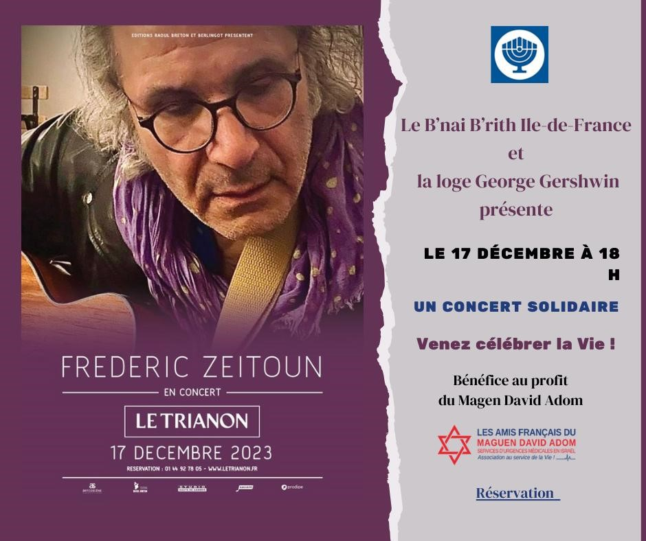 Le B’nai B’rith Ile-de-France et la loge George Gershwin ont le plaisir de s’associer au concert de Frédéric Zeitoun le dimanche 17 décembre à 18 heures au Trianon. Frédéric Zeitoun connu pour ses chroniques télévisées mais aussi et surtout, un auteur interprète de talent. Read more » »